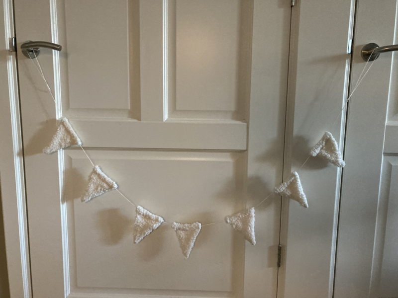 Vlaggenlijn van teddy stof van 2 meter lang met kleine driehoekjes eraan.